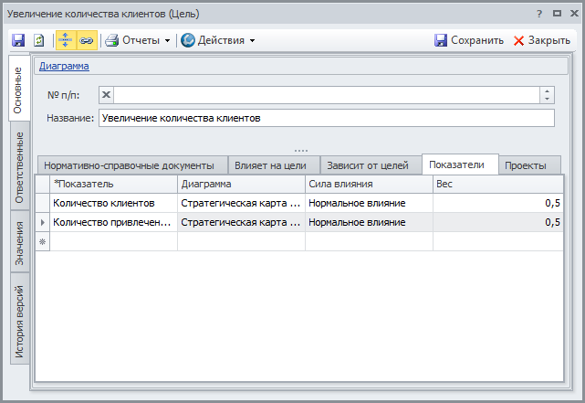 Внимание! Сила влияния должна быть одинаковой во всех связях одного показателя с одной целью (например, связь показателя и цели может присутствовать на разных стратегических картах). В случае, если силы влияния в нескольких связях одного и того же показателя с одной и той же целью будут отличаться, расчет оценки достижения этой цели будет некорректным. Для расчета оценки достижения цели будет использоваться весовой коэффициент первой связи в списке одинаковых связей одного показателя с одной целью.