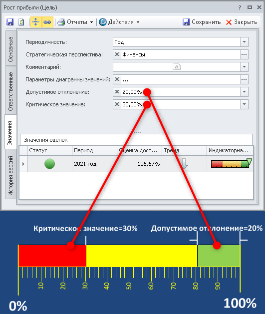 Для наглядности значения оценки достижения цели отображаются на индикаторной линейке, которая демонстрирует оценку достижения стратегической цели за период. Границы линейки от 0% до 100%. Линейка разделена на несколько зон: зеленая, желтая, красная.
