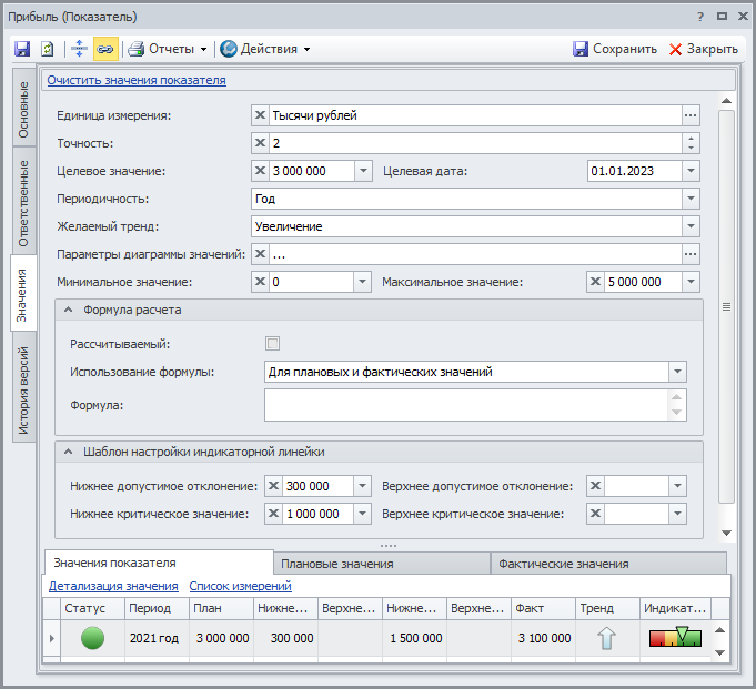 Просмотр свойств показателя осуществляется в Окне свойств показателя (Рис. 1). На вкладке Значения → Значения показателя пользователь видит список значений показателя и индикаторные линейки за периоды, попадающие в Рабочий период Business Studio.
