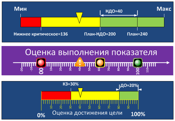 Значение оценки достижения в Красной зоне сообщает о провале в достижении цели. При этом нельзя путать с красной зоной показателя: значение показателя в красной зоне сообщает о недостатках операционной деятельности предприятия, а красный семафор в оценке достижения цели говорит о недостижении задуманной цели. При этом с точки зрения операционной деятельности все может быть достаточно приемлемо.