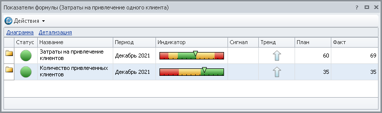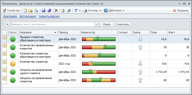 Кокпит предназначен для наглядного отображения значений показателей, оценки достижения целей, их динамики (Главное меню → ССП).