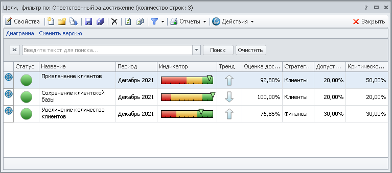 Просмотр данных по целям осуществляется в Окне справочника целей с наложенным фильтром, который показывает лишь те цели, которые должны быть показаны пользователю в соответствии с его правами на просмотр и редактирование. При помощи пункта меню Мои цели открывается Окно справочника целей с наложенным фильтром (Рис. 5). В окне отображаются лишь те цели, для которых физическое лицо, ассоциированное с пользователем, указано как ответственный за достижение. При помощи пункта меню Все цели открывается Окно справочника целей с наложенным фильтром. В окне отображаются лишь те цели, для которых физическое лицо, ассоциированное с пользователем, указано как ответственный за выполнение или контролирующее лицо. Пользователь видит перечень доступных ему целей на дату актуальности.