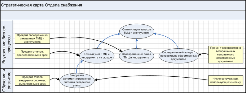 Причинно-следственная цепь - удобный инструмент для доведения ССП до нижестоящих организационных уровней. Для графического отображения взаимосвязи стратегических целей и перспектив применяют стратегическую карту.