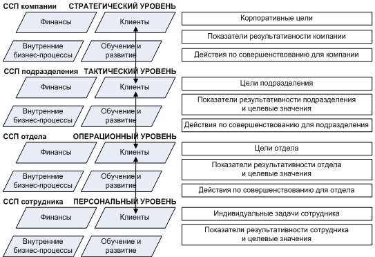 При каскадировании стратегия, указанная в корпоративной ССП (Рис. 1), распространяется на все уровни управления.