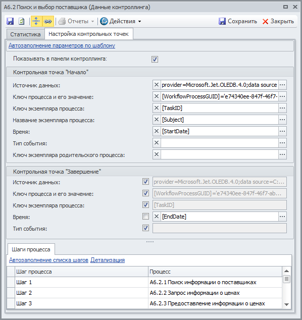 В данном окне параметры контрольных точек могут быть заполнены вручную. Также для заполнения могут использоваться специальные шаблоны, которые создаются в справочнике Шаблоны настройки контроллинга процесса (Главное меню → Анализ процессов → Шаблоны настройки контроллинга процесса). Для автозаполнения параметров настройки контрольных точек по шаблону нажмите на гиперссылку Автозаполнение параметров по шаблону.