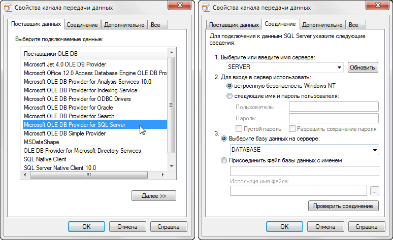 Если источником данных является база данных SQL, то в открывшемся окне настройки подключения на вкладке Поставщик данных выберите "Microsoft OLE DB Provider for SQL Server" (Рис. 3).
