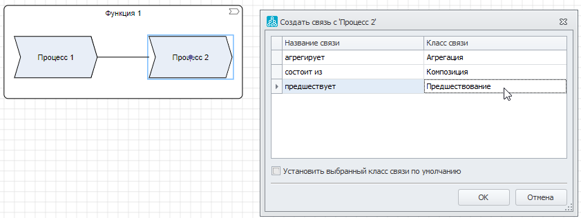 Также две функции/процесса на диаграмме VAD могут быть связаны связью класса «Предшествование» (рисунок 8) для отображения последовательно выполняемых шагов.