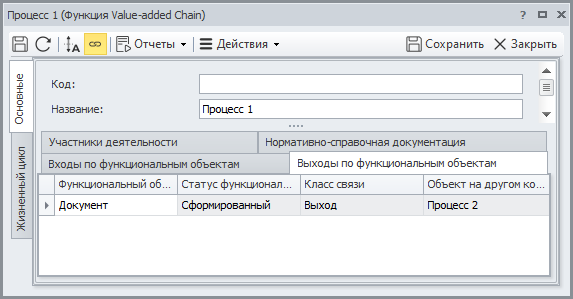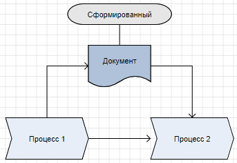 На рисунке 9 изображена передача объекта «Документ» со статусом «Сформированный» из Процесса 1 в Процесс 2. При этом в системе автоматически формируются списки входов-выходов для Процесса 1 и Процесса 2. «Документ» является выходом Процесса 1 (рисунок 10) и входом Процесса 2 (рисунок 11).