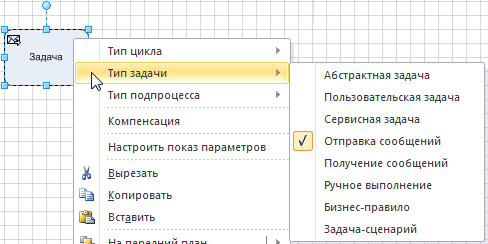 На диаграмме тип задачи и тип подпроцесса определяются при помощи одноименных подменю в контекстном меню, вызываемом от процесса (Рис. 3). После выбора типа задачи в левом верхнем углу блока задачи появляется маркер выбранного типа. По умолчанию при добавлении на диаграмму новой задачи, она добавляется с типом "Абстрактная задача". При декомпозиции процесс становится подпроцессом. По умолчанию подставляется тип подпроцесса - "Подпроцесс", если перед декомпозицией не был выбран иной тип подпроцесса.