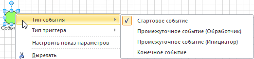 На палитре элементов предусмотрены отдельные кнопки для добавления стартового события, промежуточного события-инициатора и конечного события. После добавления события на диаграмму первоначально выбранный тип события можно изменить при помощи подменю Тип события в контекстном меню, вызываемом от события (Рис. 6).