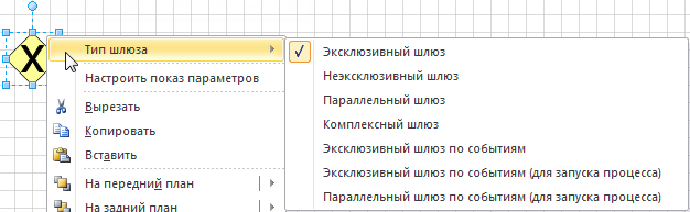 Шлюзы представляют собой точки разветвления и слияния потоков управления процесса. Шлюзы могут быть различных типов. На палитре элементов Окна диаграммы предусмотрены отдельные кнопки для добавления эксклюзивного шлюза, параллельного шлюза и неэксклюзивного шлюза, а также кнопка для добавления шлюза с выбором его типа. После добавления шлюза любого типа на диаграмму его тип можно сменить при помощи подменю Тип шлюза в контекстном меню, вызываемом от шлюза (Рис. 10).