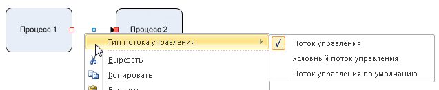 Тип потока управления, исходящего из процесса, можно сменить на условный поток или поток по умолчанию при помощи подменю Тип потока управления в контекстном меню, вызываемом от потока управления (Рис. 11). Тип условного потока управления, исходящего из эксклюзивного/неэксклюзивного шлюза, можно сменить на поток по умолчанию при помощи этого же подменю.