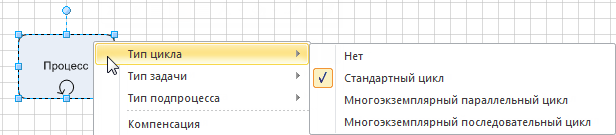 На диаграмме тип цикла для задачи или подпроцесса определяется при помощи подменю Тип цикла в контекстном меню, вызываемого от процесса (Рис. 4).