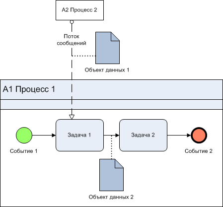 На диаграмме процесса в нотации BPMN можно показывать передачу объектов по потокам управления или потокам сообщений, связывающих 2 элемента.