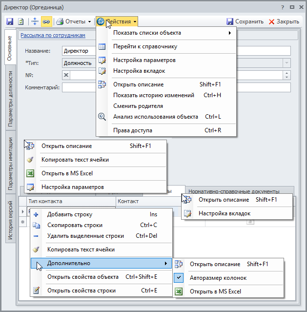 Описание назначения пунктов контекстных меню приведено в статье Контекстные меню сетки. Часть пунктов выпадающего меню кнопки Действия в Окне свойств объекта дублирует пункты контекстных меню. Другие пункты относятся к общим командам окна свойств объекта, их описание приведено в Таблице 2.