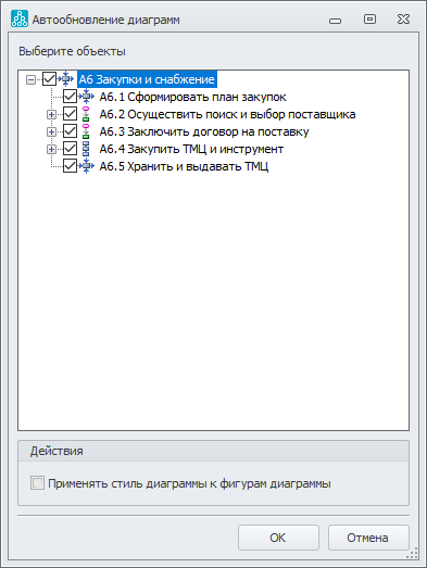 Функция автоматического обновления диаграмм используется для отображения изменений, произведенных с объектами справочников, на диаграммах. Например, в случае изменения названия объекта, использующегося на диаграммах, необходимо произвести обновление диаграмм, чтобы на них отобразились эти изменения.