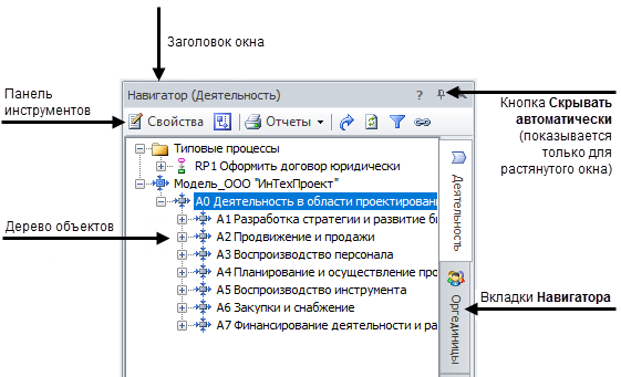 В дереве Навигатора по умолчанию показываются иерархические справочники следующих объектов: Деятельность, Оргединицы, Функциональные объекты, Методы управления, Шаблоны отчетов, Группы. Объекты каждого из справочников выводятся на отдельной вкладке, на которой указано название класса и его иконка.