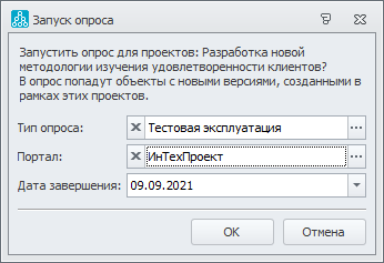 Запуск опроса по требованию осуществляется вручную с помощью операции Запуск опроса (Главное меню → Управление моделью → Запуск опроса) В появившемся окне (см. Рисунок 4) указывается тип опроса, портал, на который опрос будет отправлен, а также дата завершения опроса.