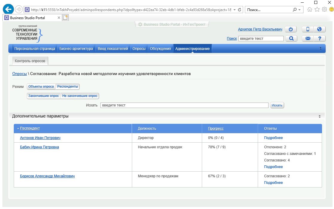 | Тестовая эксплуатация | Тип опроса, предназначенный для проведения тестовой эксплуатации бизнес-архитектуры на ограниченном списке сотрудников. |