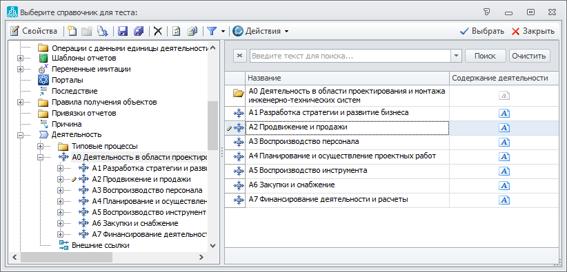 В появившемся окне выбирается справочник, папка, группа объектов или конкретный объект. Результат выполнения теста опроса выводится в соответствующем окне. В примере на Рисунке 21 показано, что при выполнении теста опроса "Согласование" от единицы деятельности "А2 Продвижение и продажи" получен пользователь "Бабич Ирина Петровна".
