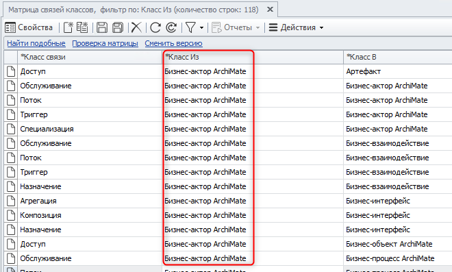 Внимание! Данный способ является более быстрым, чем первый. Но он требует большего внимания, так как он привести к конфликту с первой онтологией. Это может произойти из-за того, что элементы Матрицы связей классов могут действовать и на подклассы. Таким образом, между объектами первой онтологии возможно будет создавать связи из второй онтологии, которые им не свойственны. Например, связь Композиция стала бы возможной между Должностью (Объект Из) и Подразделением (Объект В), так как она задана для Бизнес-акторов в онтологии ArchiMate. А это неправильно: должность не может состоять из подразделений.