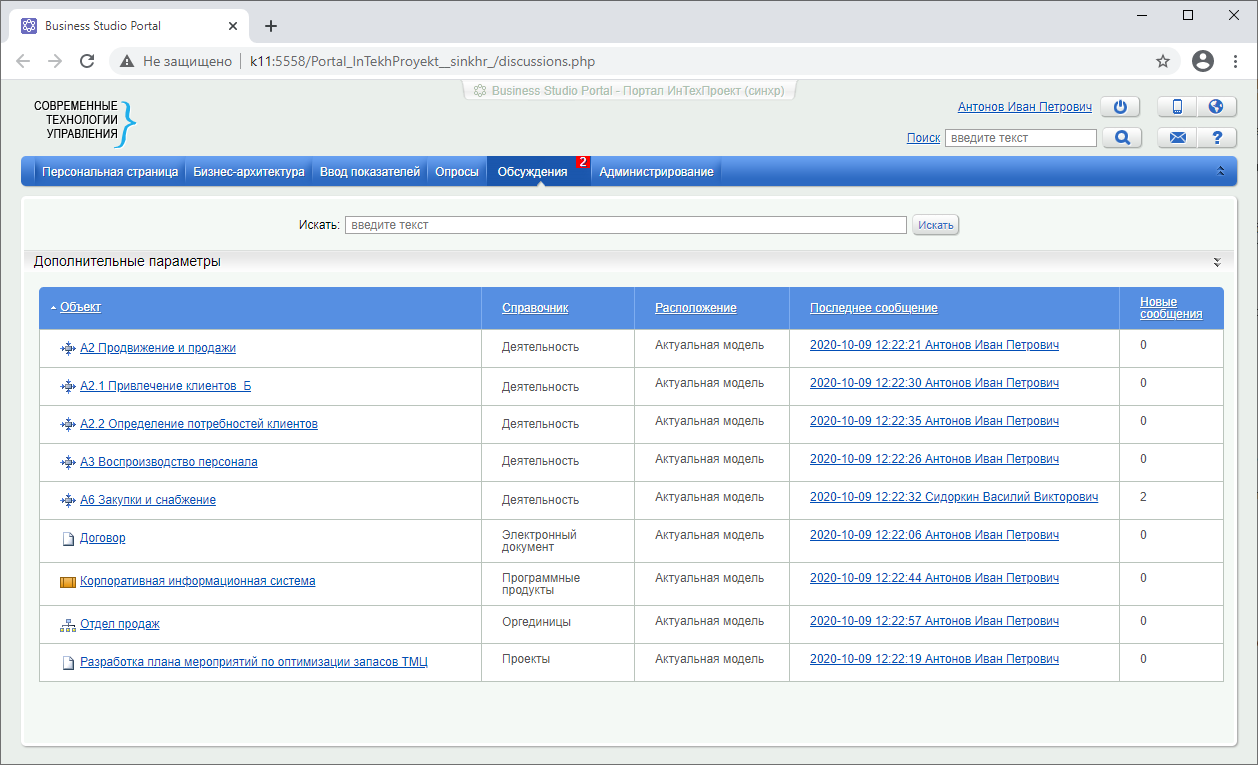 В разделе Обсуждения отображаются последние сообщения в обсуждениях объектов модели, на которые у пользователя есть права (Рис. 3).