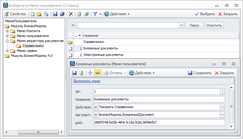 В справочнике администрирования "Меню пользователя" необходимо создать меню. Например, создать папку "Меню редактора документов" − она будет соответствовать группе меню. Добавить в ней папку "Справочники" − это будет пункт главного меню. Добавить в нем элемент "Бумажные документы" − это будет пункт меню. Заполнить параметры: "№" − "1"; "Название" - "Бумажные документы"; "Действие" - "Показать справочник"; "Аргумент" - выбрать класс "Бумажный документ" (Рис. 2). По гиперссылке Выполнить меню можно проверить работу пункта меню. Выбором пункта меню будет открываться форма списка "Бумажный документ". Аналогично добавить пункт меню "Электронные документы". Подробное описание дано в Mеню пользователя.
