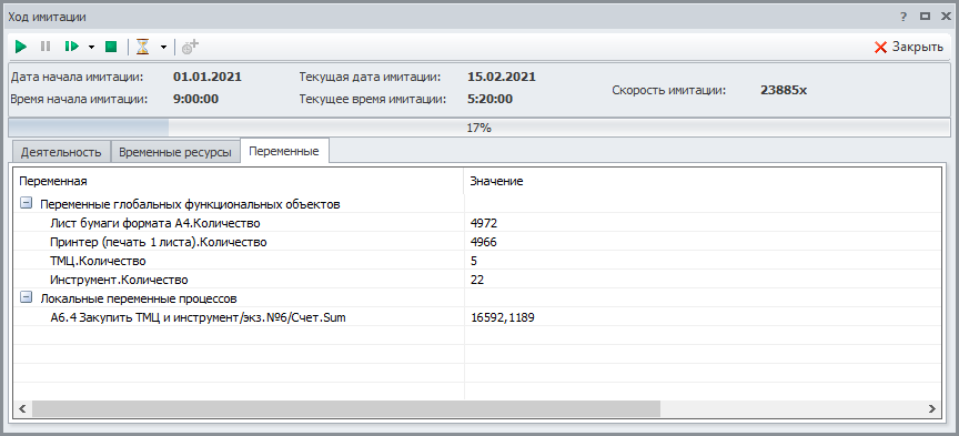 На вкладке Переменные (Рис. 4) отображаются значения экземпляров переменных, используемых при проведении имитации.