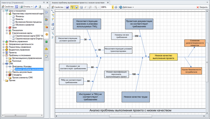 Более подробно о работе с диаграммой Исикавы можно ознакомиться в главе Руководство пользователя → Диаграмма Исикавы.