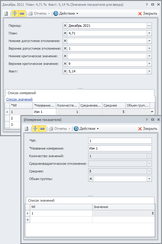 Если по внесенным значениям измерений будет осуществляться построение контрольной карты альтернативного признака, то для каждого измерения необходимо заполнить параметры "№", "Название измерения" и "Объем группы" (группы, которая будет оцениваться на наличие несоответствующих единиц). В списке значений измерения указывается только одно значение (Рис. 5). Для него заполняются параметры "№" и "Значение" (число единиц, признанных несоответствующими).