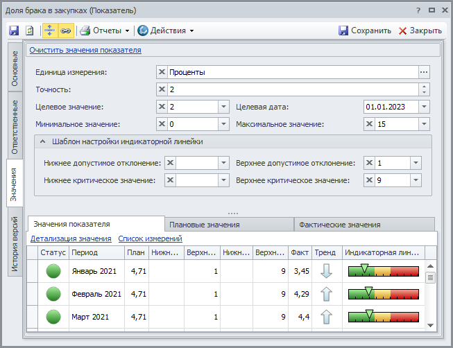 Каждый показатель сопровождается в системе Business Studio встроенной индикаторной линейкой, которая для выбранного периода наглядно показывает при помощи "ползунка" положение фактического значения показателя в интервале между минимальным и максимальным значениями. Есть возможность устанавливать границы допуска на значения показателя - это критическое значение снизу и критическое значение сверху. Фактические значения показателей, находящиеся за пределами границ допуска, будут отображаться в красной зоне. Фактические значения показателей, находящиеся внутри границ допуска, будут в желтой зоне. Если фактическое значение показателя равно плановому значению или в пределах допустимого отклонения, то значение будет в зеленой зоне. Цвет параметра "Статус" дополнительно подсказывает, в каком состоянии находится текущее значение показателя относительно этих границ допуска. Подробно о работе с показателями можно ознакомиться в методике Разработка сбалансированной системы показателей.
