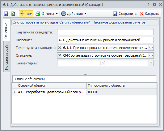 Заполнение вкладки Связи с объектами в свойствах требования (пункта) стандарта может осуществляться путем переноса нужного элемента на вкладку из соответствующего справочника Навигатора.