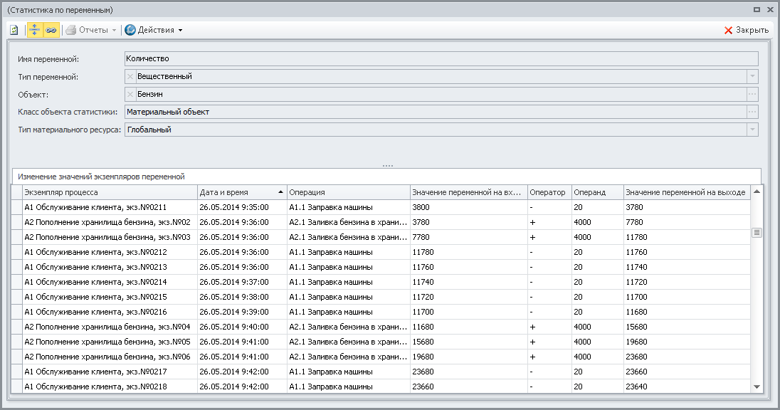 Таким образом, мы модифицировали модель. Теперь как только значение экземпляра переменной "Количество" имитирующего материального ресурса "Бензин" становится меньше 1000 литров, запускается на выполнение экземпляр имитирующего процесса "Пополнение хранилища бензина" и меняется значение экземпляра переменной "Флажок с требованием наполнить хранилище". Новые экземпляры имитирующего процесса "Пополнение хранилища бензина" не будут запускаться до тех пор, пока значение экземпляра переменной "Флажок с требованием наполнить хранилище" не вернется в начальное состояние и не станет равным 0.