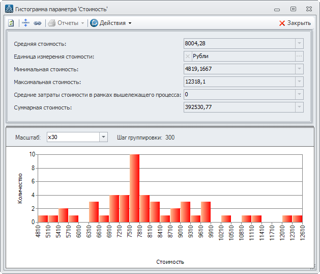 | Гистограмма | Гистограмма распределения значений параметра "Стоимость" завершенных экземпляров имитирующего процесса. |
