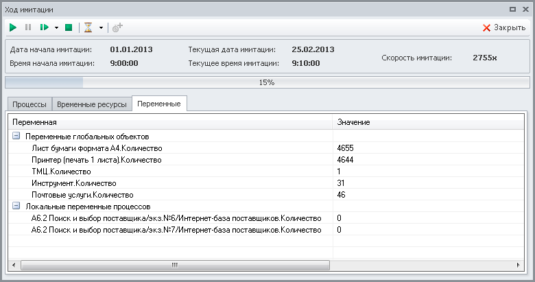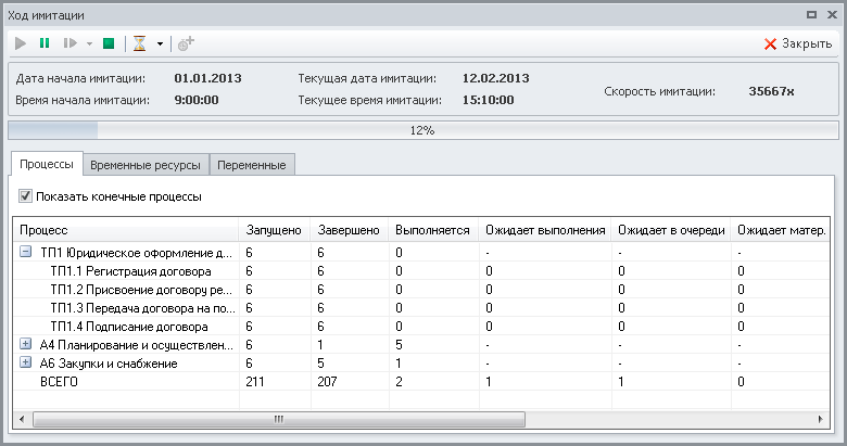 | Запущено | Отображает количество запущенных экземпляров имитирующего процесса на текущие дату и время имитации. |