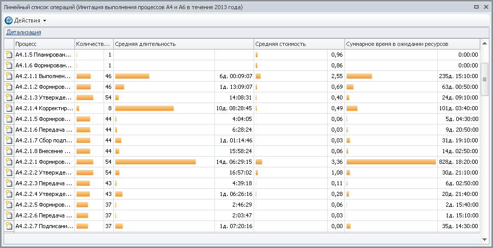 Таким образом, используя вкладку Подпроцессы и гиперссылку Детализация, можно осуществить пошаговый анализ неудовлетворительных значений параметров имитирующего процесса, выделяя на каждом уровне имитирующие подпроцессы с неудовлетворительными характеристиками.