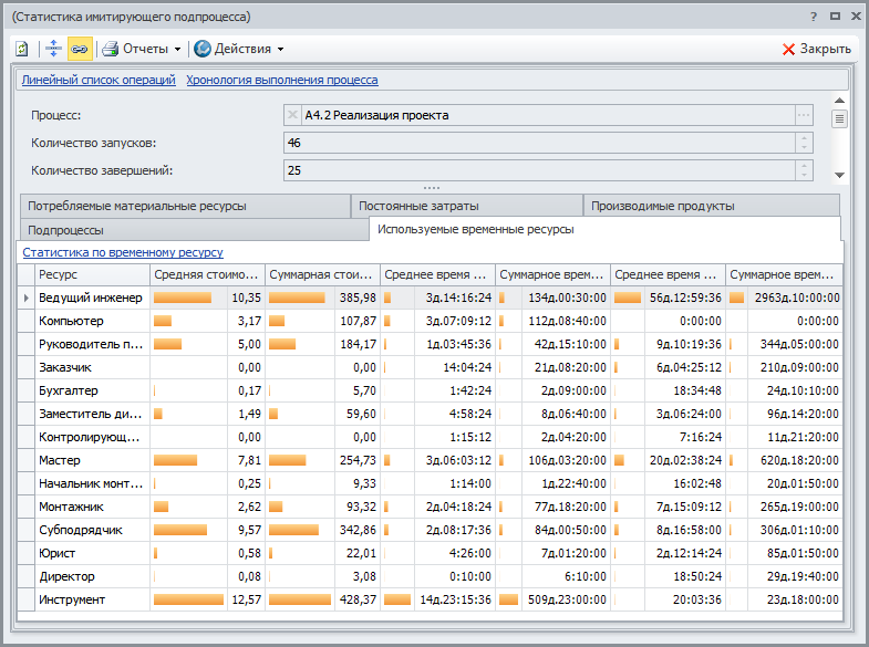 Проанализировать это можно при помощи вкладки Используемые временные ресурсы (Рис.2) окна Статистика имитирующего процесса или Статистика имитирующего подпроцесса (Рис.1).