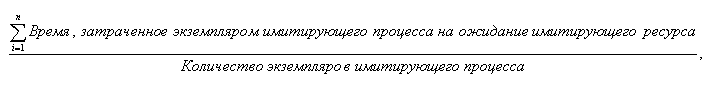 | Среднее время ожидания | Среднее время, затрачиваемое экземпляром имитирующего процесса на ожидание имитирующего материального ресурса. Параметр рассчитывается по формуле: где n - количество экземпляров имитирующего процесса. В значении параметра учитываются только завершенные экземпляры имитирующего процесса. |