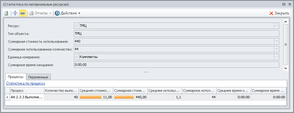 | Средняя стоимость использования | Средняя стоимость потребления имитирующего материального ресурса при выполнении экземпляра имитирующего процесса. Рассчитывается в валюте имитации. Параметр рассчитывается по формуле: |