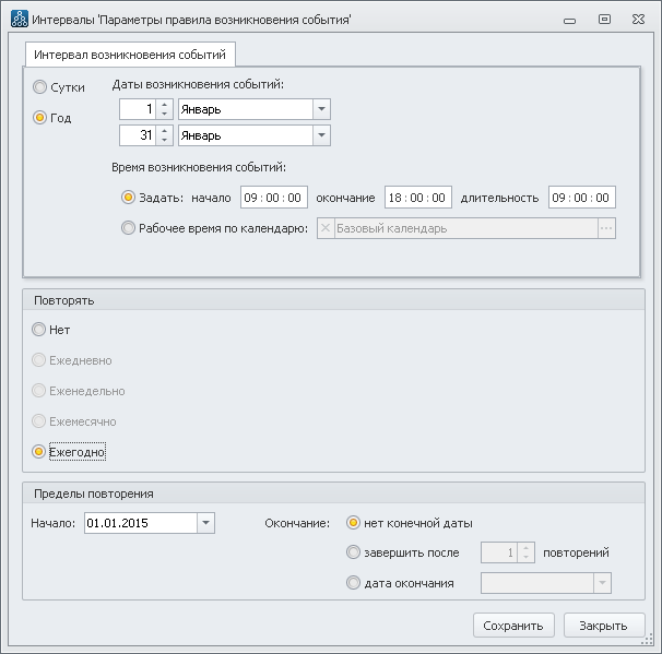 | Пределы повторения | Задает либо интервал дат, в течение которого возникают экземпляры события по указанным ранее правилам, либо количество повторений интервала возникновения экземпляров события, если не указано "Нет" в значении параметра "Повторять" . |