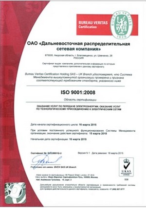 ОАО «ДРСК» (входит в состав Холдинга «РАО Энергетические системы Востока») получило сертификат соответствия интегрированной системы менеджмента (ИСМ) требованиям международных стандартов ISO 9001:2008, ISO 14001:2004 и OHSAS 18001:2007.