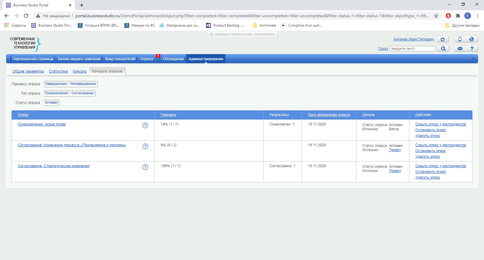 После того как изменения в бизнес-архитектуре компании будут воплощены в реальности, информация из рабочей ветки переносится в актуальную модель, и компания начинает работать по-новому. Business Studio Portal персонально оповещает сотрудников компании о появлении новых версий объектов в их зоне внимания. Сотрудник должен ознакомиться с новыми версиями в специальном разделе портала «Опросы» и поставить отметку об ознакомлении.