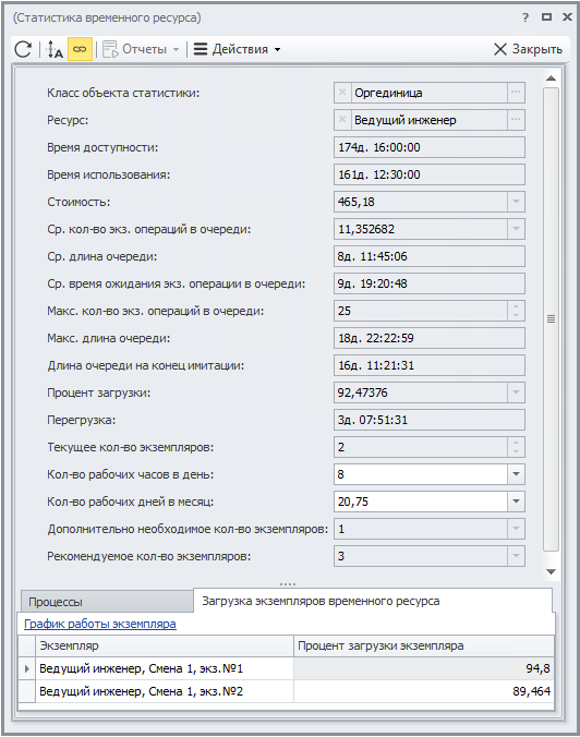 В результате проведения имитационного моделирования и ФСА Business Studio рассчитывает текущую загрузку ресурса, его перегрузку и рекомендуемое количество ресурсов, а также позволяет найти «бутылочные горлышки».