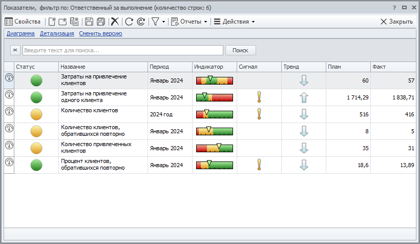 Контроль показателей осуществляется с помощью Business Studio Portal. На портале ответственные лица наглядно видят текущее состояние каждого из ключевых показателей деятельности компании с помощью цветового сигнализатора «Статус».