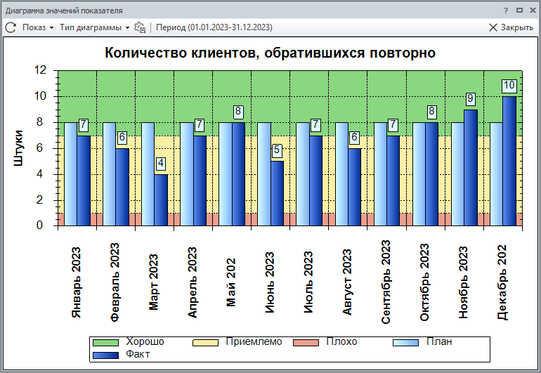 Можно произвести декомпозицию рассчитываемого показателя вплоть до самого нижнего уровня и найти тот показатель, который вызвал отклонение. Также в портале можно посмотреть динамику изменений показателей. Графики покажут состояние показателей по каждому периоду на фоне заданных границ нормальных и тревожных значений.