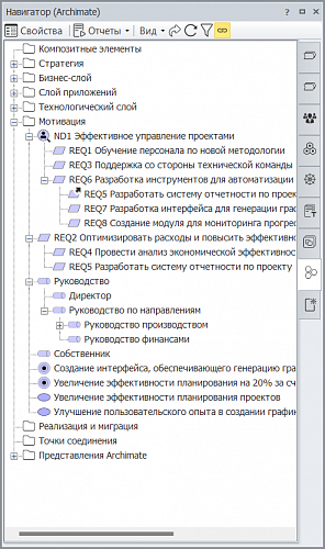 Пользователям Business Studio доступен язык ArchiMate, который поддерживает методологию TOGAF. ArchiMate позволяет объединенить различные представления об архитектуре предприятия благодаря еë послойному моделированию: стратегический уровень, бизнес-уровень, уровень приложений, технологический уровень. Использование ArchiMate помогает визуализировать автоматизируемые бизнес-процессы и функции, взаимодействие и потоки между разными системами, анализировать взаимосвязь бизнес-требований и ИТ-инфраструктуры, формировать корректные требования к ИТ-решениям.