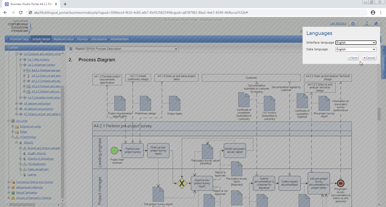 Мультиязычность модели, реализованная в редакции Ultimate, призвана обеспечить требования транснациональных компаний, в которых бизнес-модель должна существовать на нескольких языках. Business Studio поддерживает неограниченное количество языков модели.