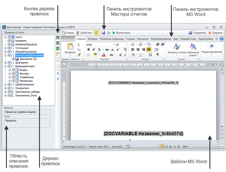 Business Studio изначально разрабатывалась для того, чтобы в простой наглядной форме представлять информацию из моделей для широких кругов заинтересованных лиц: от руководителей и сотрудников до внешних подрядчиков. Для этого Business Studio содержит мощный Мастер отчетов, позволяющий формировать отчеты с использованием всех возможностей форматирования Microsoft Word и поддерживающий сложные выборки данных.