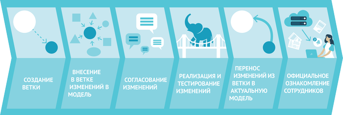Часто организационные изменения затрагивают сразу несколько элементов модели: процессы, должности, документы, структуру информационной системы, показатели и т. п. При этом весь блок изменений нужно удерживать как одно целое: согласовывать в рамках рабочей группы, исправлять замечания и переносить в актуальную модель, не забыв ни один элемент. Эту задачу берет на себя механизм веток (branches). После того как изменения в бизнес-архитектуре компании будут воплощены в реальности, информация из рабочей ветки переносится в актуальную модель, и компания начинает работать по‑новому. Business Studio Portal персонально оповещает сотрудников компании о появлении новых версий объектов в их зоне внимания.